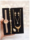 প্রিমিয়াম ব্ল্যাক জুয়েলারি কম্বো সেট একটি মার্জিত ও রাজকীয় লুক পেতে এই কমপ্লিট সেটটি হতে পারে আপনার সেরা পছন্দ। সেটটিতে রয়েছে: স্টাইলিশ হাতঘড়ি: পাথর খচিত গোল্ডেন ফ্রেম এবং কালো চেইন যুক্ত। ভ্যান ক্লিফ স্টাইল নেকলেস: জনপ্রিয় ফ্লাওয়ার মোটিফ এবং কালো পাথরের কাজ করা চেইন। ম্যাচিং ব্রেসলেট ও কানের দুল: গলার হারের সাথে মিল রেখে তৈরি চার পাতার ডিজাইন। জমকালো চুড়ি সেট: গোল্ডেন ও ব্ল্যাক স্টোনের কাজ করা একাধিক চুড়ি। বৈশিষ্ট্য: কালার: লাক্সারি গোল্ডেন ও জেট ব্ল্যাক। উপলক্ষ: বিয়ে, পার্টি বা যেকোনো উৎসবের জন্য মানানসই।