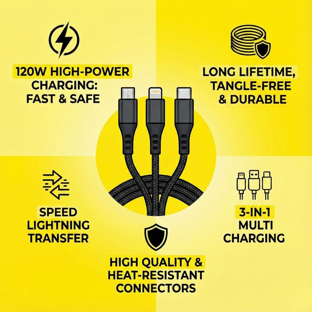 Awei CL-972 3-in-1 Fast Charging Cable (120W) – Nylon Braided USB-C, Lightning & Micro-USB Multi-Charger (1.2M)